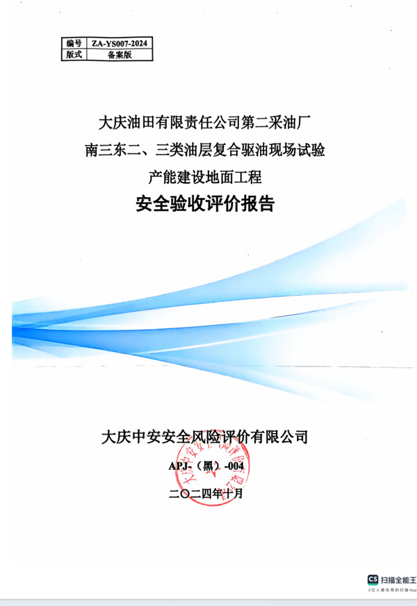 大慶油田有限責(zé)任公司第二采油廠南三東二、三類油層復(fù)合驅(qū)油現(xiàn)場試驗產(chǎn)能建設(shè)地面工程安全驗收評價報告
