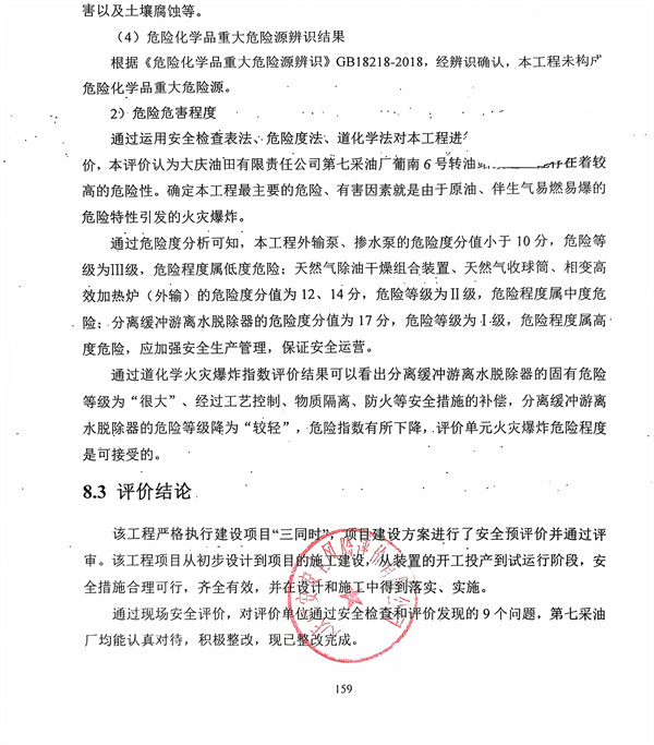 該工程嚴格執(zhí)行建設項目“三同時”,項目建設方案進行了安全預評價并通過評審。該工程項目從初步設計到項目的施工建設,從裝置的開工投產(chǎn)到試運行階段,安全措施合理可行,齊全有效,并在設計和施工中得到落實、實施。 通過現(xiàn)場安全評價,對評價單位通過安全檢查和評價發(fā)現(xiàn)的9個問題,第七采油廠均能認真對待,積極整改,現(xiàn)已整改完成。 結(jié)論:大慶油田有限責任公司第七采油廠葡南6號轉(zhuǎn)油站改造工程安全設施符合“三同時”要求,試運行情況良好,安全生產(chǎn)管理有效,具備安全驗收的條件。 |