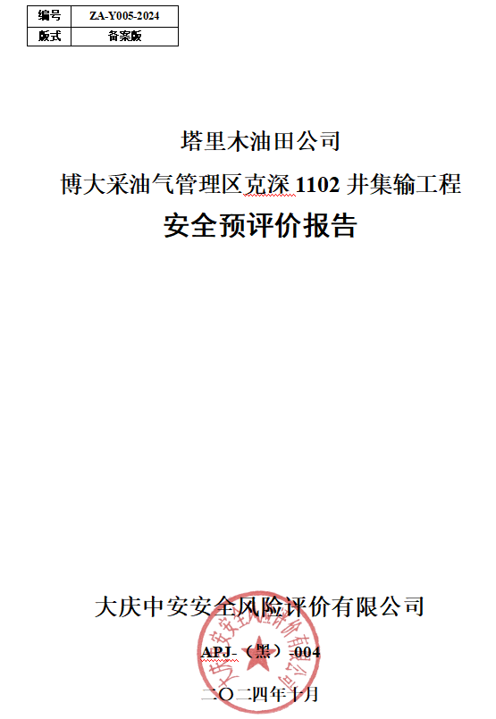 塔里木油田公司博大采油氣管理區(qū)克深1102井集輸工程安全預(yù)評(píng)價(jià)報(bào)告