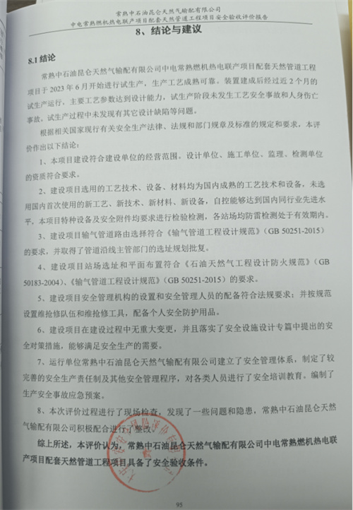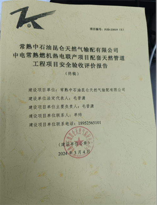 常熟中石油昆侖天然氣輸配有限公司中電常熟燃機熱電聯(lián)產項目配套天然管道工程項目安全設施竣工驗收評價報告