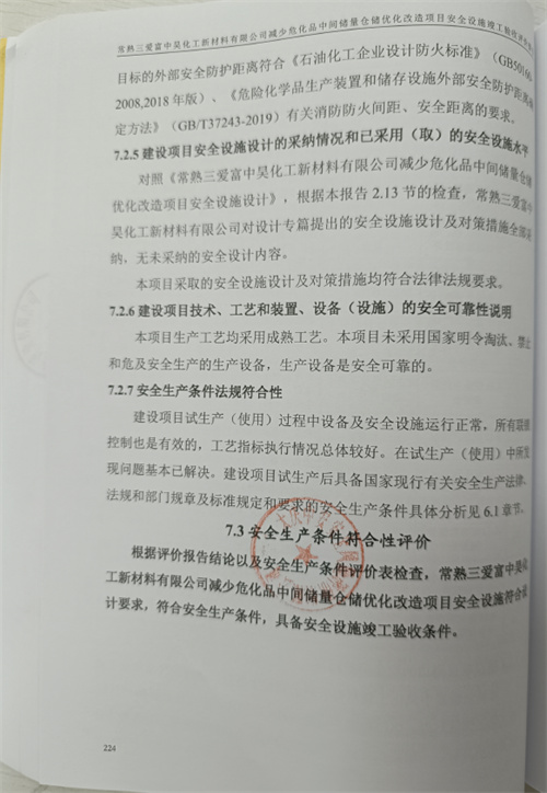 常熟三愛富中昊化工新材料有限公司減少?;分虚g儲量倉儲優化改造項目安全設施符合設計要求,符合安全生產條件,具備安全設施竣工驗收條件 |
