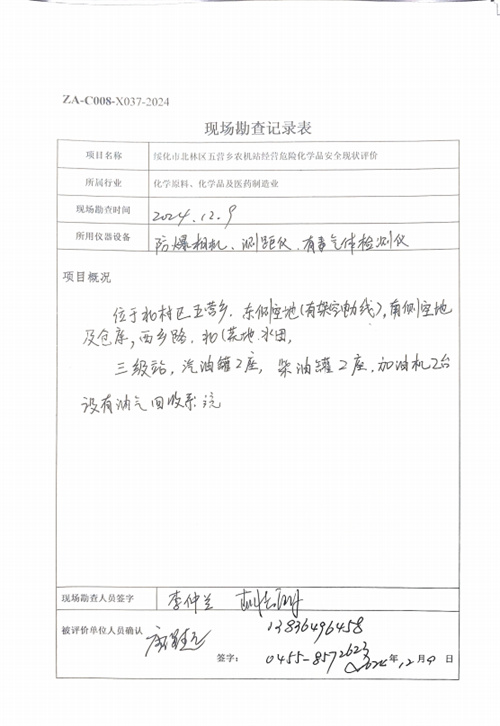 綏化市北林區五營鄉農機站的外部安全條件、總平面布置、儲存、銷售過程,工藝設備設施(儲罐區、加油區、站房)、消防設施、供配電裝置、加油卸油作業等方面的安全技術措施、安全防護設施、安全管理及應急管理等。 |