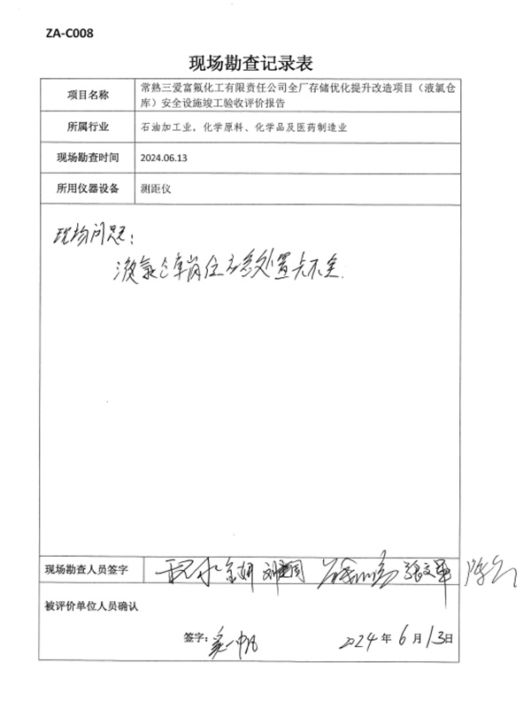 常熟三愛富氟化工有限責任公司全廠存儲優化提升改造項目(液氯倉庫)安全設施符合設計要求,具備安全設施竣工驗收條件。