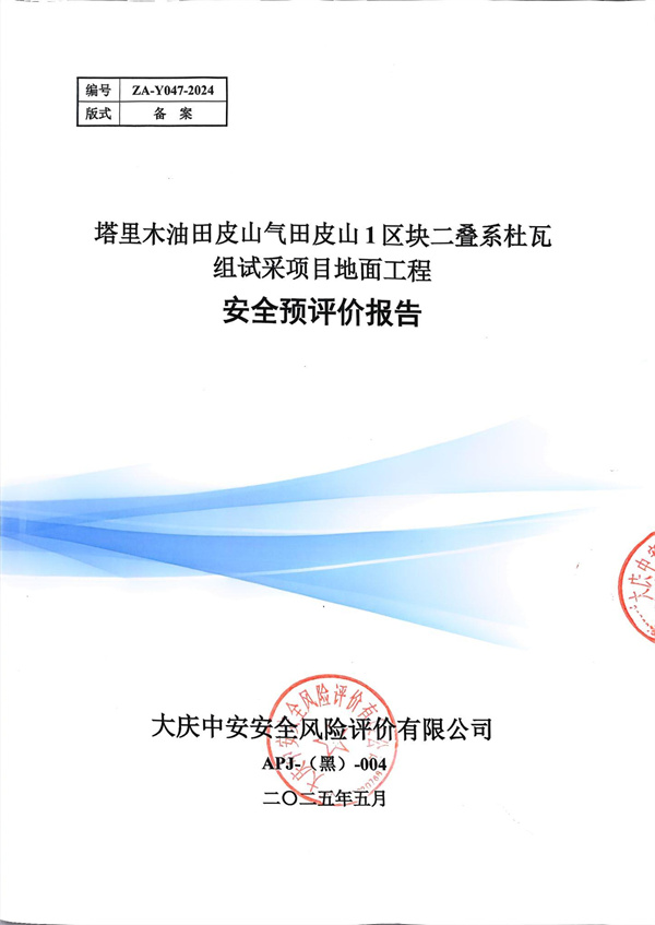 塔里木油田皮山氣田皮山1區塊二疊系杜瓦組試采項目地面工程安全預評價報告 |