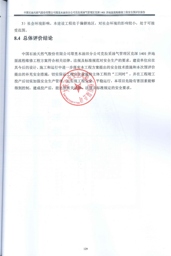中國(guó)石油天然氣股份有限公司塔里木油田分公司克拉采油氣管理區(qū)克深1401井地面流程維修工程方案符合相關(guān)法律、法規(guī)及標(biāo)準(zhǔn)規(guī)范對(duì)安全生產(chǎn)的要求。建設(shè)單位應(yīng)在其今后的設(shè)計(jì)、施工和運(yùn)行中進(jìn)一步落實(shí)本工程方案提出的安全技術(shù)措施和本次預(yù)評(píng)價(jià)提出的補(bǔ)充安全措施,切實(shí)保證工程安全設(shè)施和主體工程的“三同時(shí)”,并在工程竣工投產(chǎn)后切實(shí)加強(qiáng)安全生產(chǎn)管理,以實(shí)現(xiàn)工程安全、平穩(wěn)運(yùn)行,本項(xiàng)目危險(xiǎn)有害因素能夠得到控制,建成投產(chǎn)后,能達(dá)到有關(guān)法律、法規(guī)及標(biāo)準(zhǔn)規(guī)定的安全要求。 |
