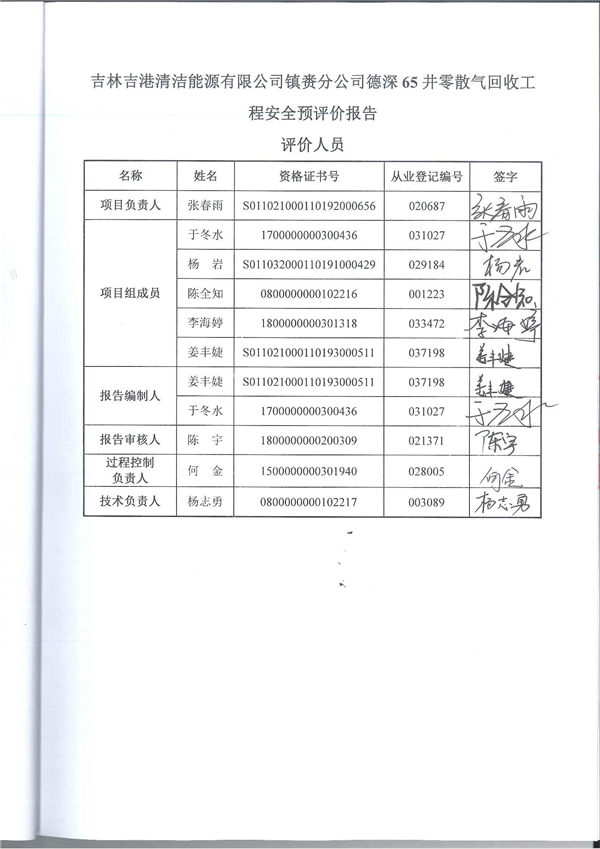 吉林吉港清潔能源有限公司鎮賚分公司德深65井零散氣回收工程安全預評價報告 |