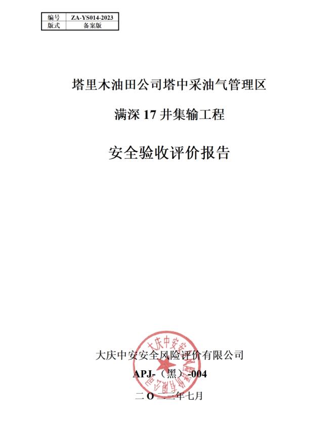 塔里木油田公司塔中采油氣管理區滿深17井集輸工程安全驗收評價