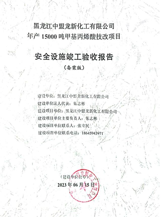 黑龍江中盟龍新化工有限公司年產(chǎn)15000噸甲基丙烯酸技改項(xiàng)目安全驗(yàn)收評(píng)價(jià)報(bào)告
