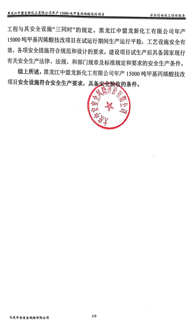 黑龍江中盟龍新化工有限公司年產(chǎn)15000噸甲基丙烯酸技改項(xiàng)目安全設(shè)施符合安全生產(chǎn)要求,具備安全驗(yàn)收的條件。 |