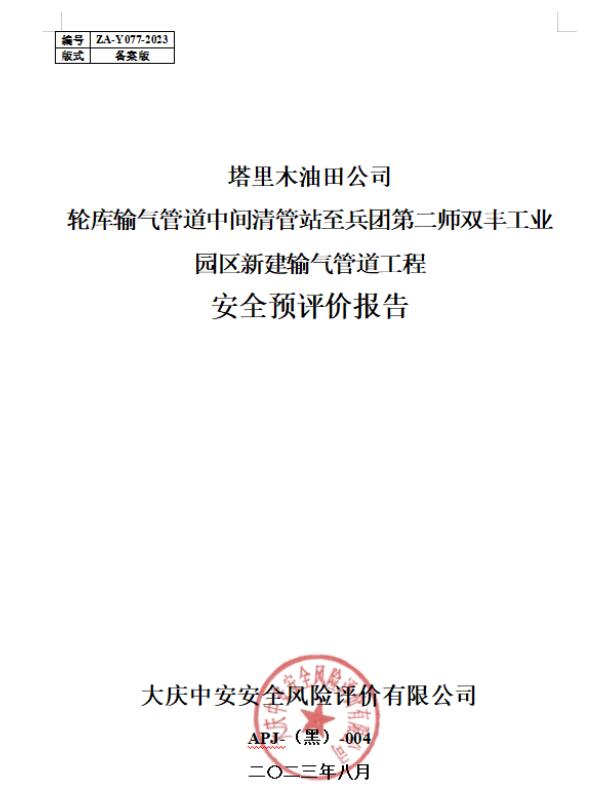 塔里木油田公司輪庫(kù)輸氣管道中間清管站至兵團(tuán)第二師雙豐工業(yè)園區(qū)新建輸氣管道工程安全預(yù)評(píng)價(jià)報(bào)告