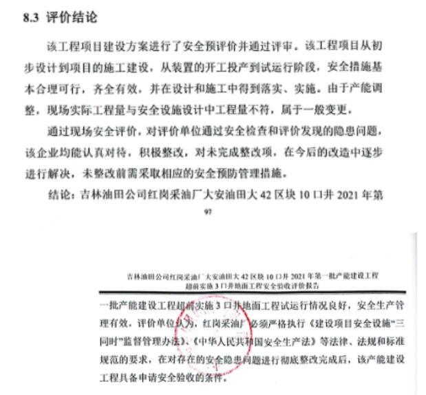 吉林油田公司紅崗采油廠大安油田大42區(qū)塊10口井2021年第一批產(chǎn)能建設(shè)工程超前實(shí)施3口井地面工程試運(yùn)行情況良好,安全生產(chǎn)管理有效,評(píng)價(jià)單位認(rèn)為,紅崗采油廠必須嚴(yán)格執(zhí)行《建設(shè)項(xiàng)目安全設(shè)施“三同時(shí)”監(jiān)督管理辦法》、《中華人民共和國(guó)安全生產(chǎn)法》等法律、法規(guī)和標(biāo)準(zhǔn)規(guī)范的要求,在對(duì)存在的安全隱患問題進(jìn)行徹底整改完成后,該產(chǎn)能建設(shè)工程具備申請(qǐng)安全驗(yàn)收的條件。 |