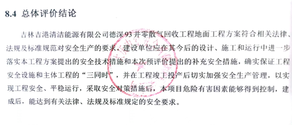 吉林吉港清潔能源有限公司德深93井零散氣回收工程地面工程方案符合相關法律、法規及標準規范對安全生產的要求。建設單位應在其今后的設計、施工和運行中進一步落實本工程方案提出的安全技術措施和本次預評價提出的補充安全措施,確實保證工程安全設施和主體工程的“三同時”,并在工程竣工投產后切實加強安全生產管理,以實現工程安全、平穩運行,采取安全對策措施后,本項目危險有害因素能夠得到控制,建成后,能達到有關法律、法規及標準規定的安全要求。 |