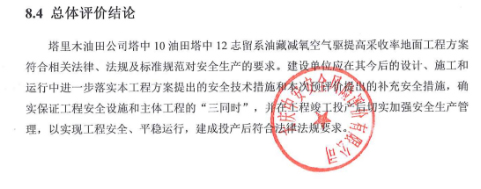 塔里木油田公司塔中10油田塔中12志留系油藏減氧空氣驅提高采收率地面工程方案符合相關法律、法規及標準規范對安全生產的要求。建設單位應在其今后的設計、施工和運行中進一步落實本工程方案提出的安全技術措施和本次預評價提出的補充安全措施,確實保證工程安全設施和主體工程的“三同時”,并在工程竣工投產后切實加強安全生產管理,以實現工程安全、平穩運行,建成投產后符合法律法規要求。 |
